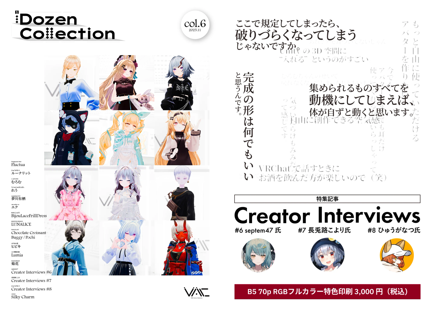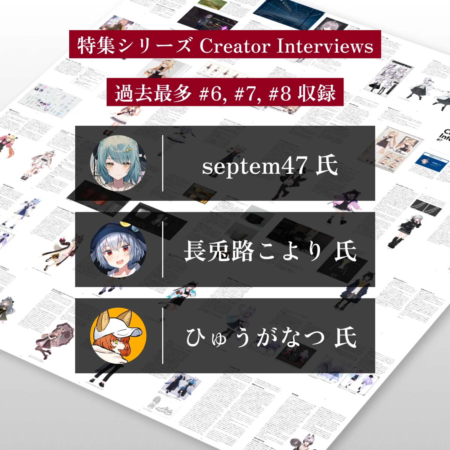 クリエイターの創作を深掘りする特集「Creator Interviews」では、#6 septem47氏, #7 長兎路こより氏, #8 ひゅうがなつ氏 の3特集を掲載。制作を振り返りつつ、クリエイターの創作の世界を深掘りした特集は、ファンのみならず、これから創作に挑戦するクリエイター必見の内容です。
