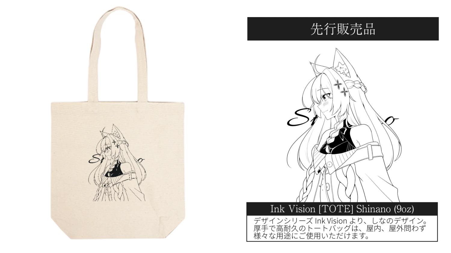 VRC Avatar Collection では、現在新デザインシリーズ「Ink Vision」の制作を進行しております。今回のイベントでは、シリーズの先行販売として、アバター「しなの」デザインのトートバッグを販売します。