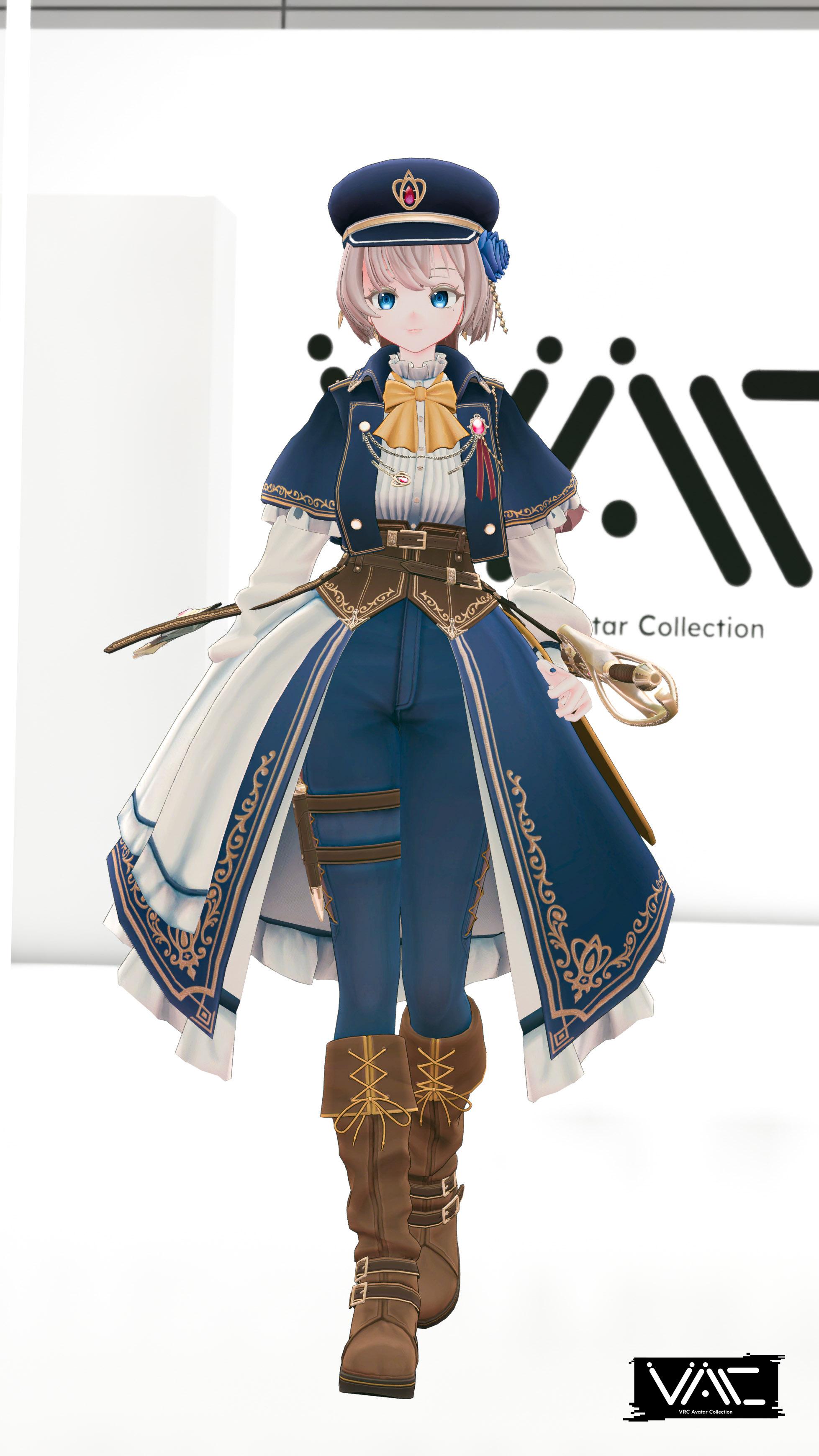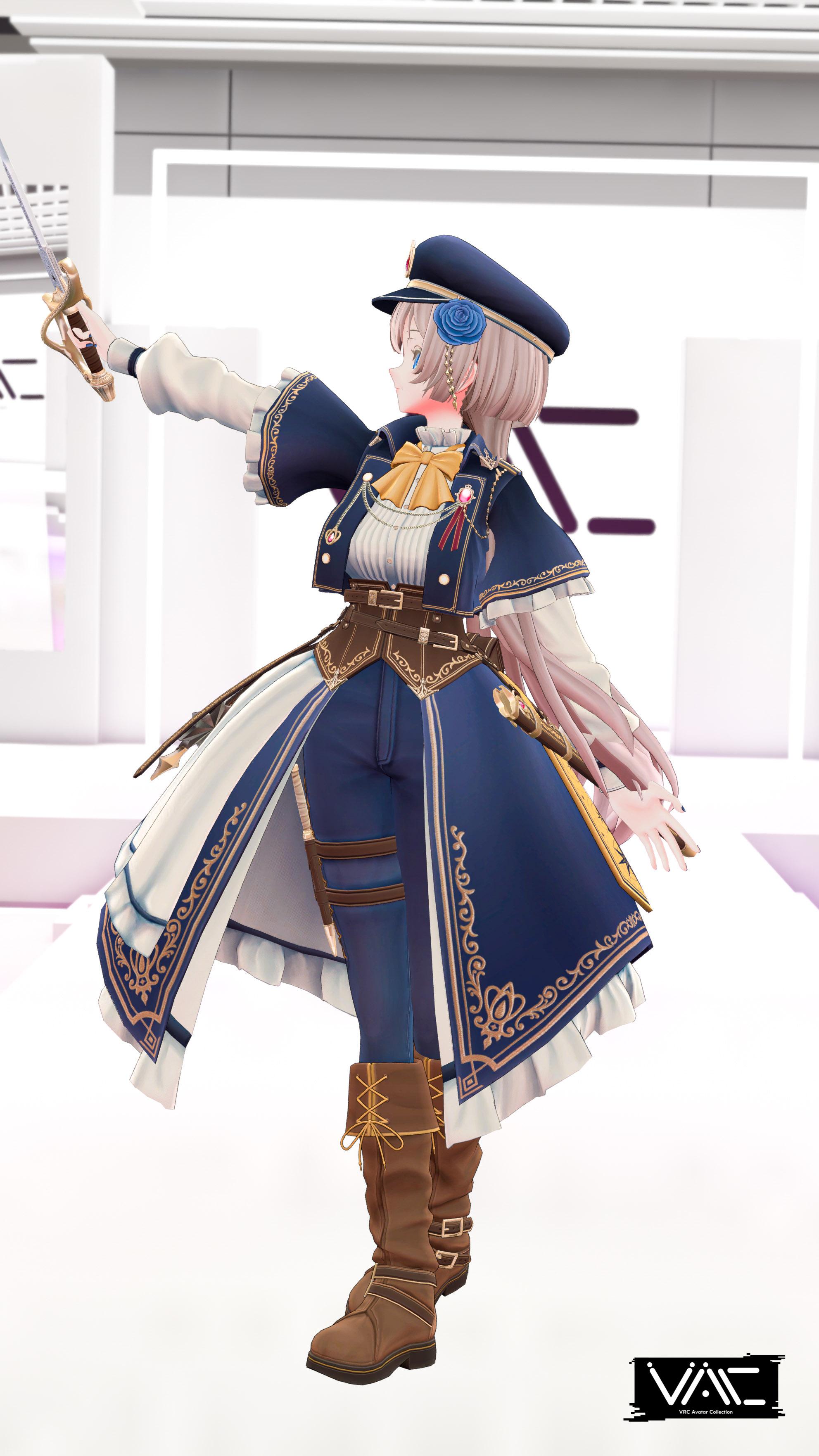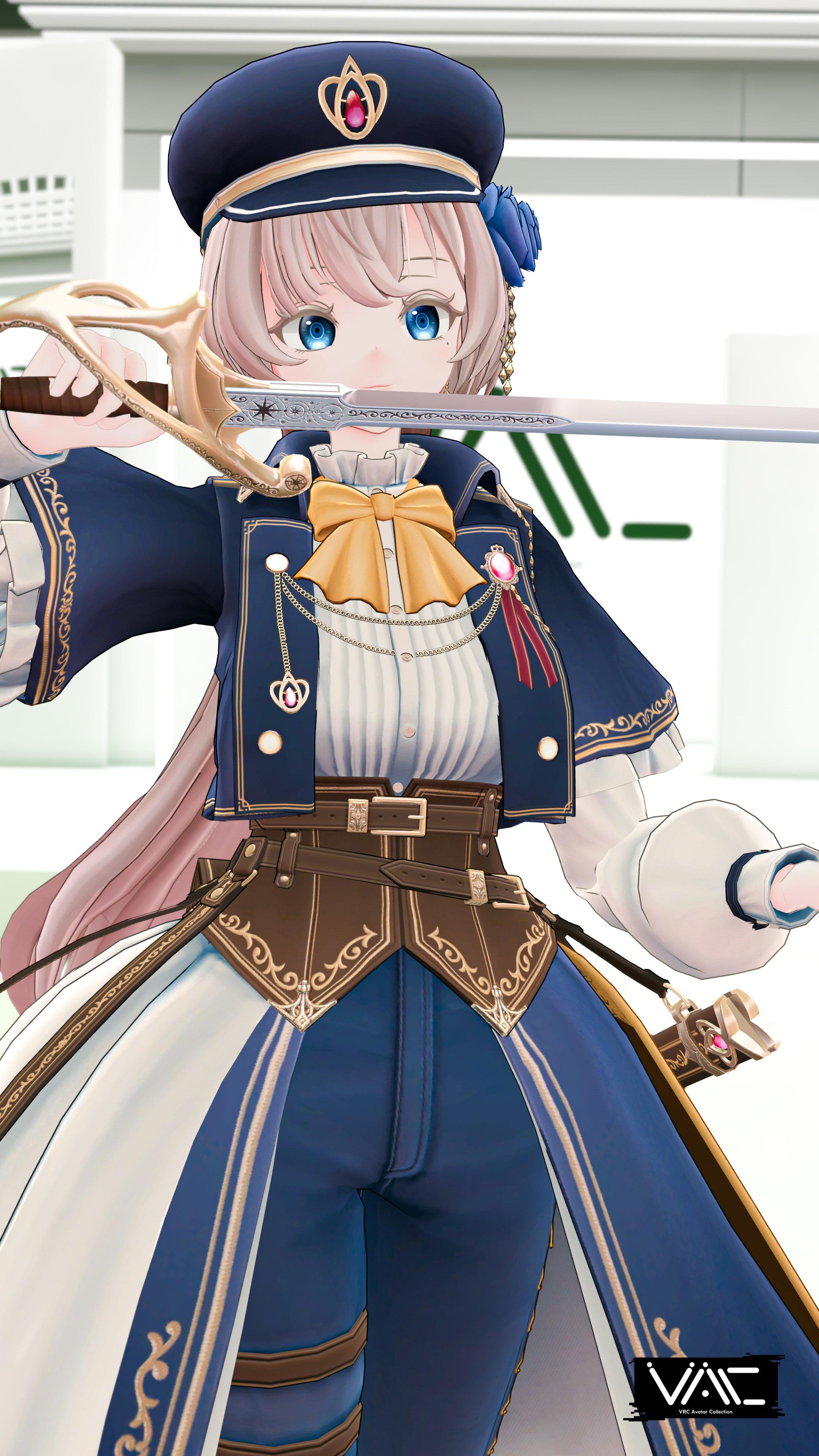 王宮に仕える近衛兵をモチーフにしたオリジナルの3Dモデルです。サーベルを引き抜いたり、ナイフを手に持つといったギミックが搭載されています。帽子や眼鏡、サーベルはメニューから着脱が可能です。43個のシェイプキーにより、多彩な表情を作成できます。シェーダーはlilToonを使用しており、PC版VRChatにのみ対応しています。