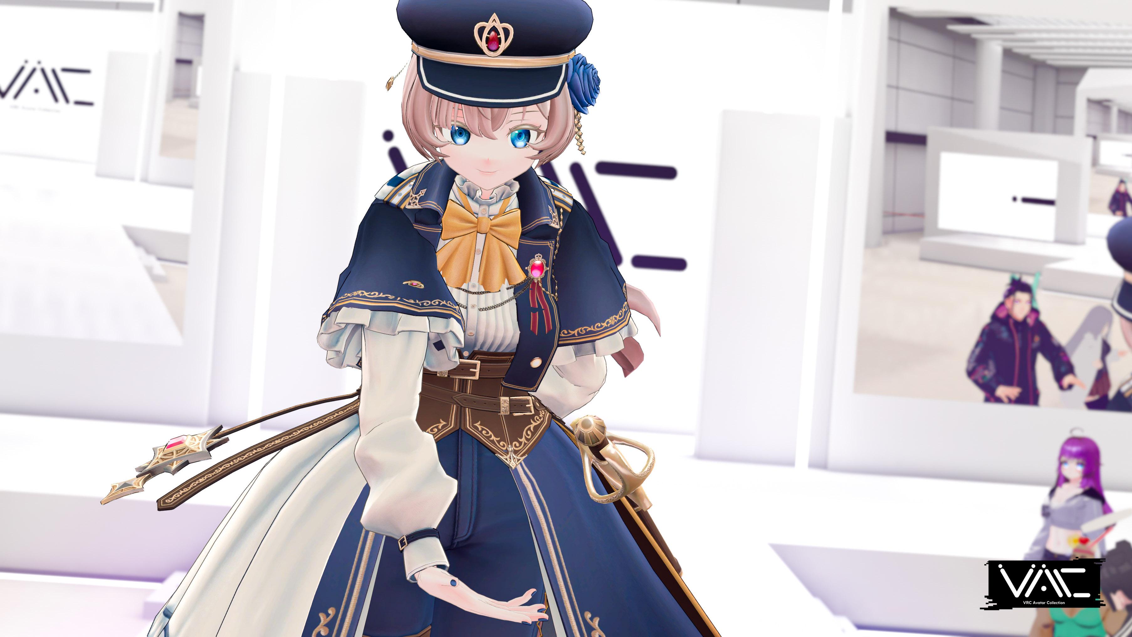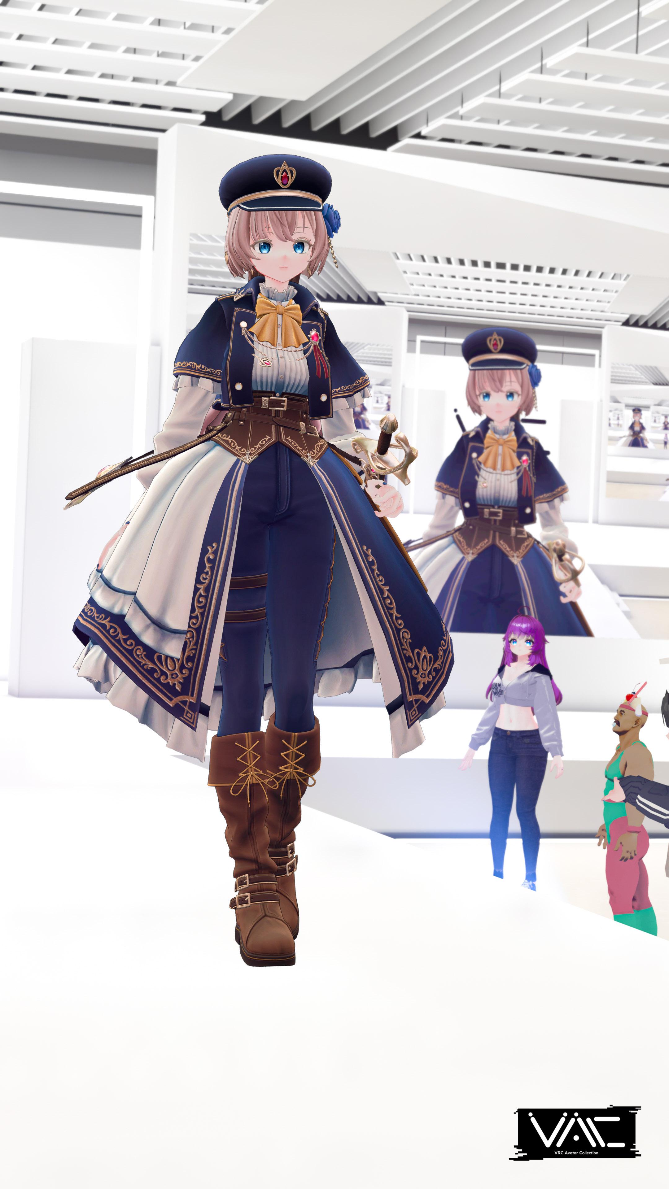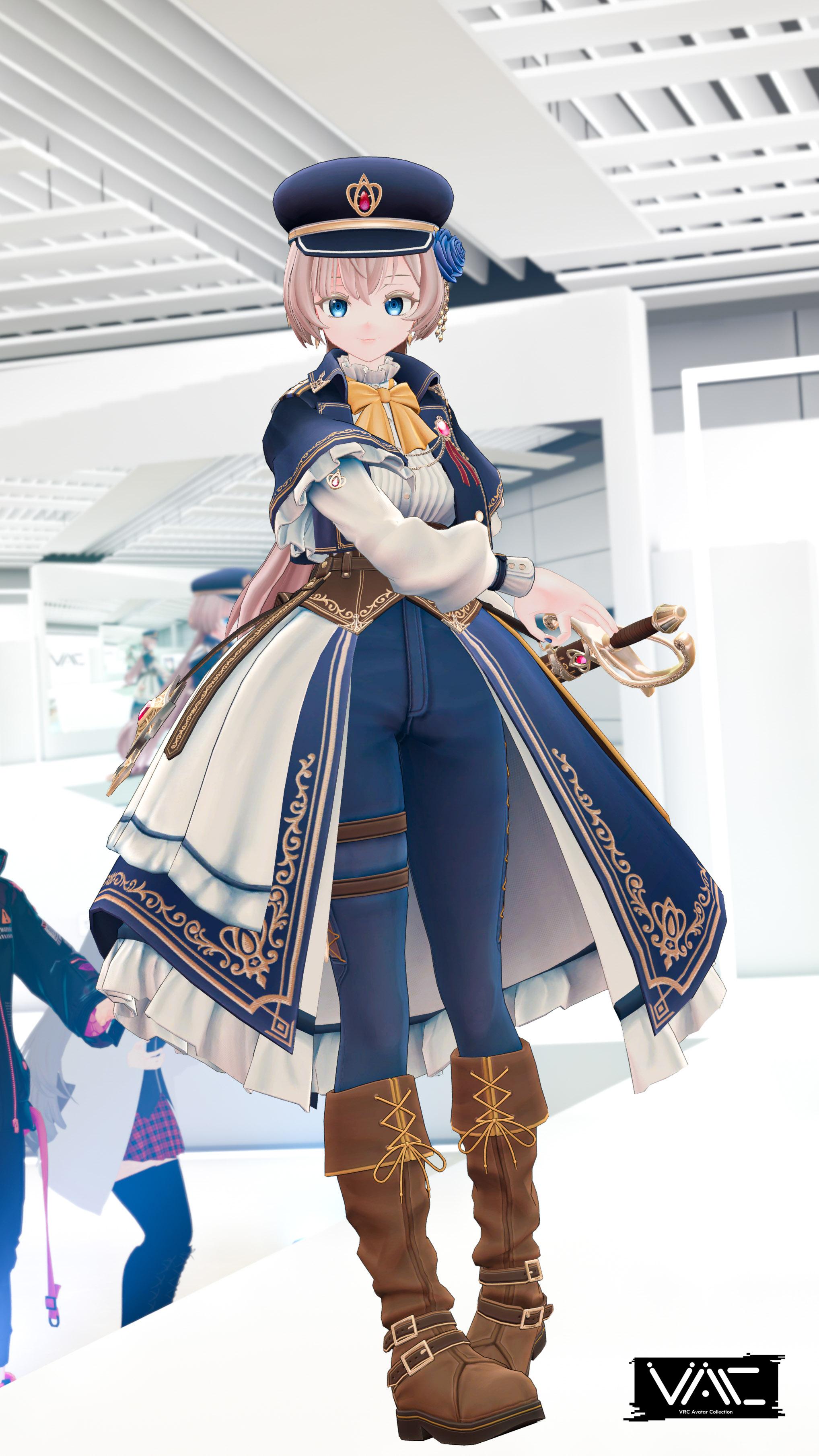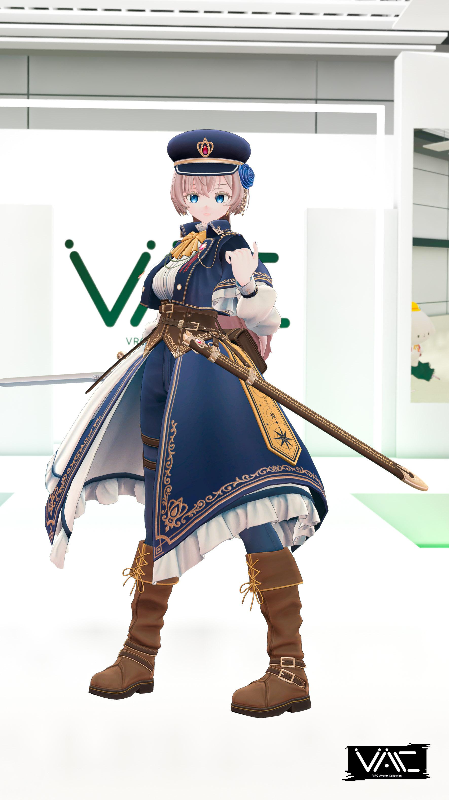 王宮に仕える近衛兵をモチーフにしたオリジナルの3Dモデルです。サーベルを引き抜いたり、ナイフを手に持つといったギミックが搭載されています。帽子や眼鏡、サーベルはメニューから着脱が可能です。43個のシェイプキーにより、多彩な表情を作成できます。シェーダーはlilToonを使用しており、PC版VRChatにのみ対応しています。