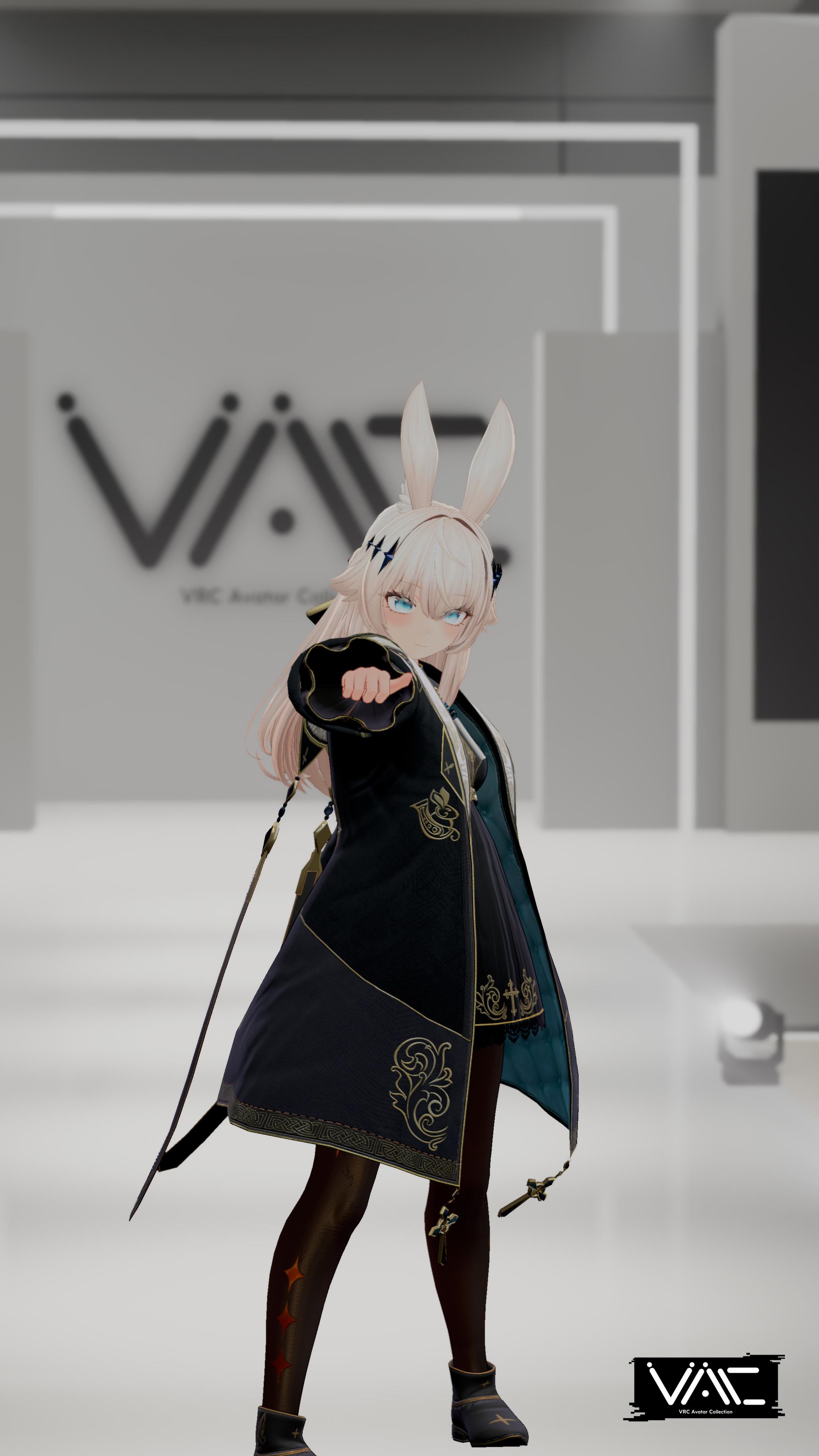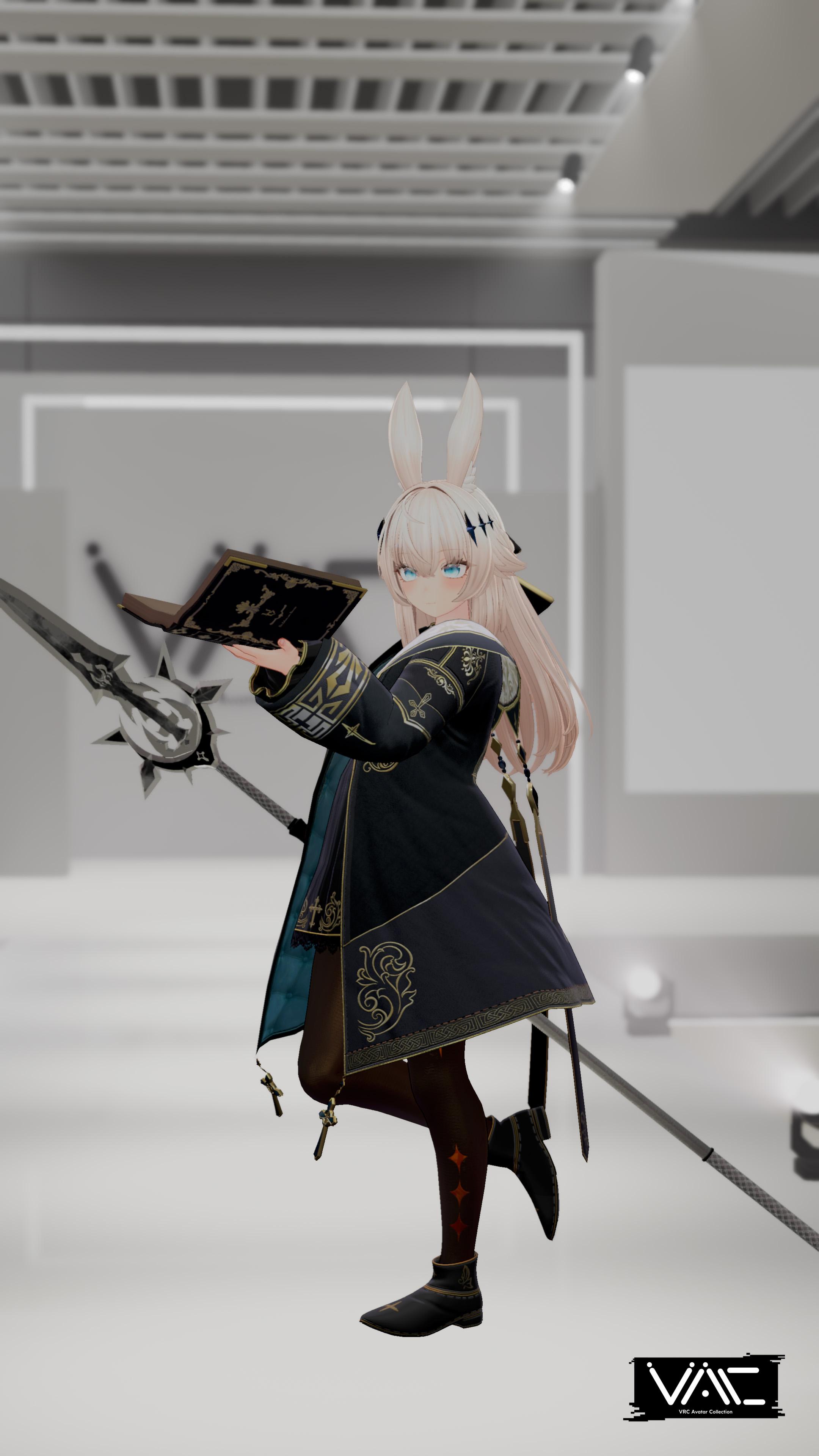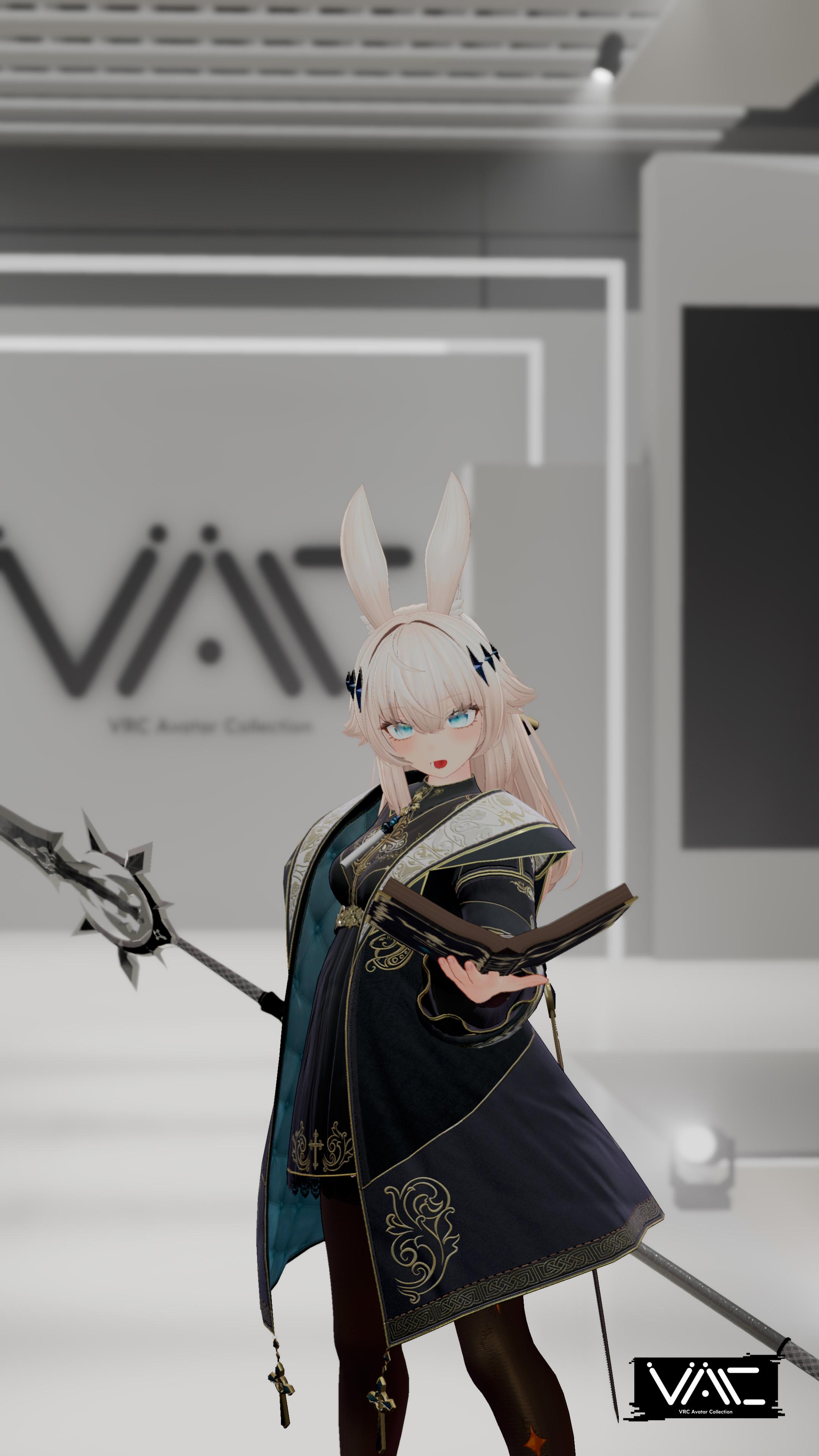 ・全体的に神秘的なイメージになるようデザインしました ・金色の金属オーナメントが映える黒に近いネイビー色な服 ・動きが映えるように背中から伸びた謎布 ・うさぎのアバターなので着せ替えで上着とスカートを脱ぐとバニーっぽくなるように(アバターメニューで実装地味) ・目隠し、槍、本のアイテムを標準実装、遊びの幅をもたせました ・フェイストラッキング(VRCFT)に標準対応 ・コートの裏面、スカートの裏面は別マテリアル、テクスチャにすることで改変の際細かい所の個性を出しやすく