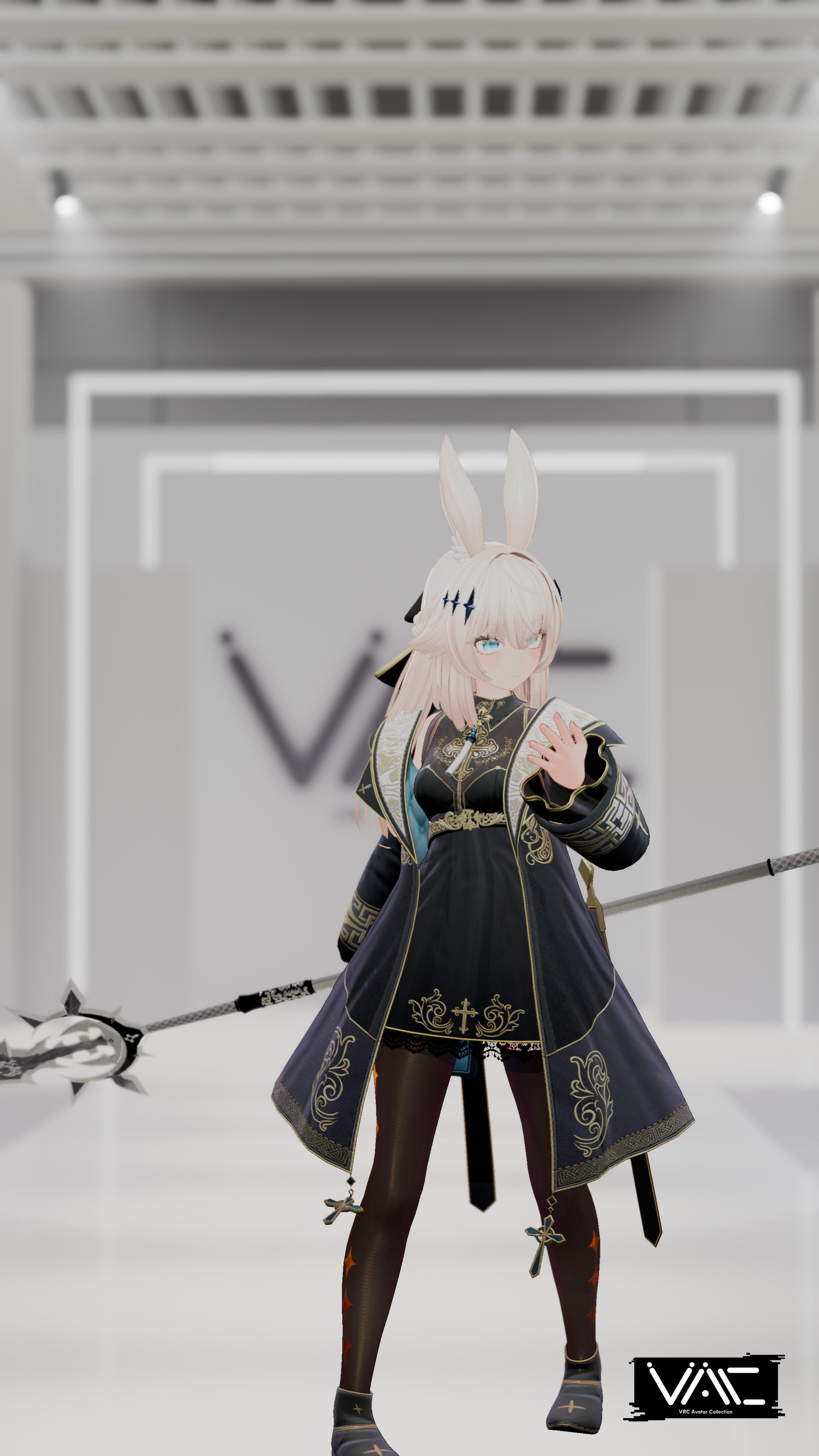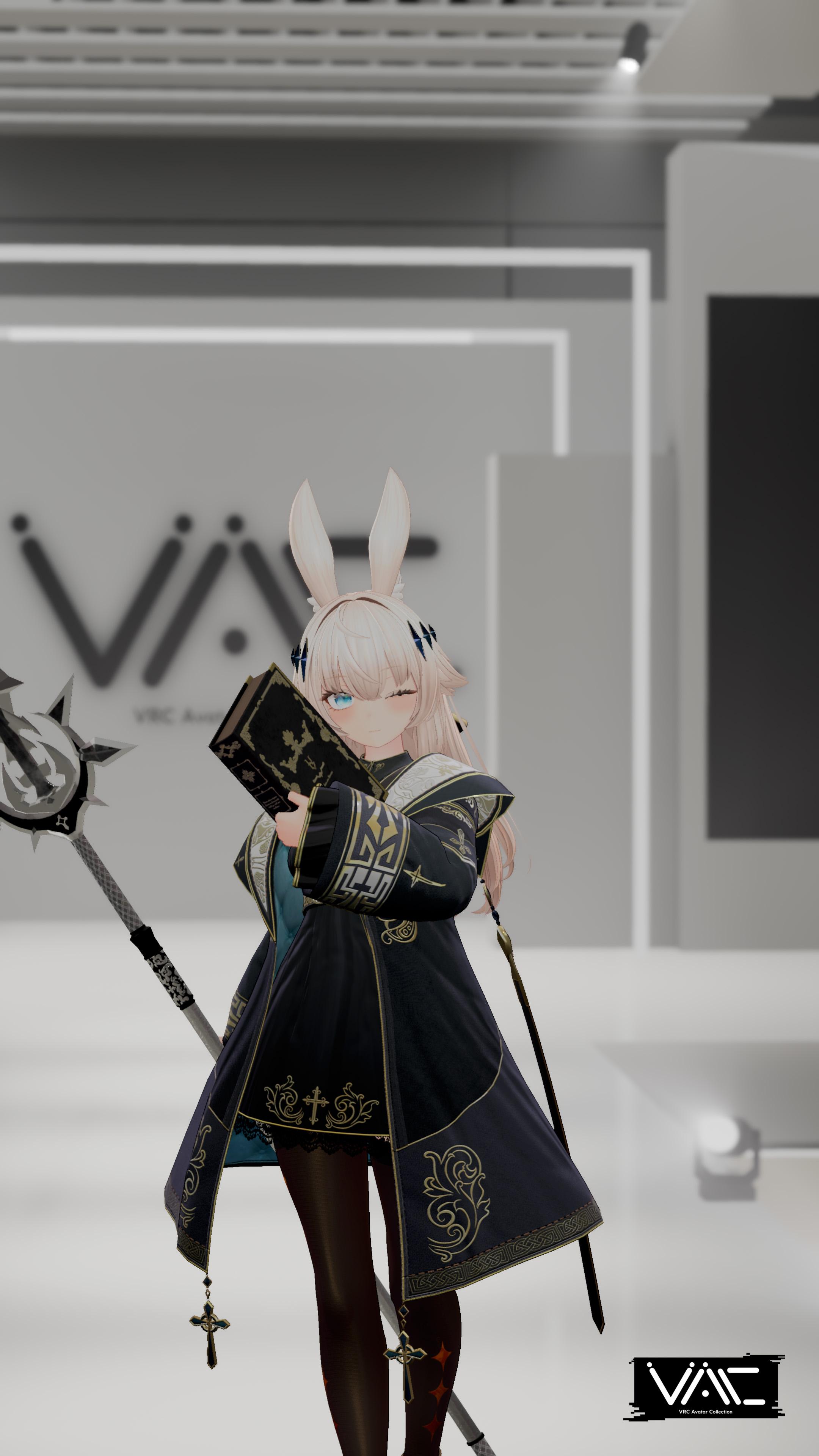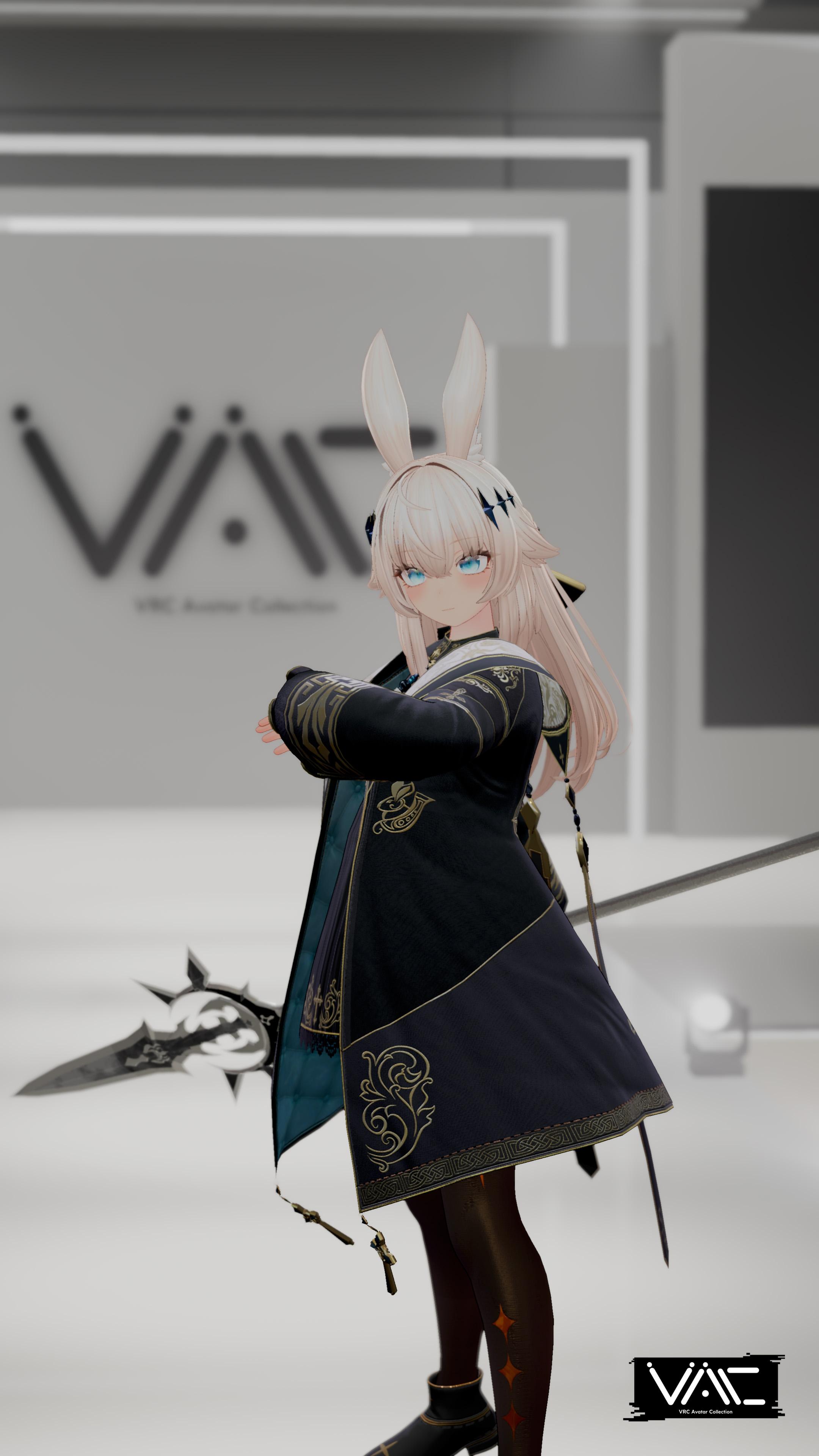 ・全体的に神秘的なイメージになるようデザインしました ・金色の金属オーナメントが映える黒に近いネイビー色な服 ・動きが映えるように背中から伸びた謎布 ・うさぎのアバターなので着せ替えで上着とスカートを脱ぐとバニーっぽくなるように(アバターメニューで実装地味) ・目隠し、槍、本のアイテムを標準実装、遊びの幅をもたせました ・フェイストラッキング(VRCFT)に標準対応 ・コートの裏面、スカートの裏面は別マテリアル、テクスチャにすることで改変の際細かい所の個性を出しやすく