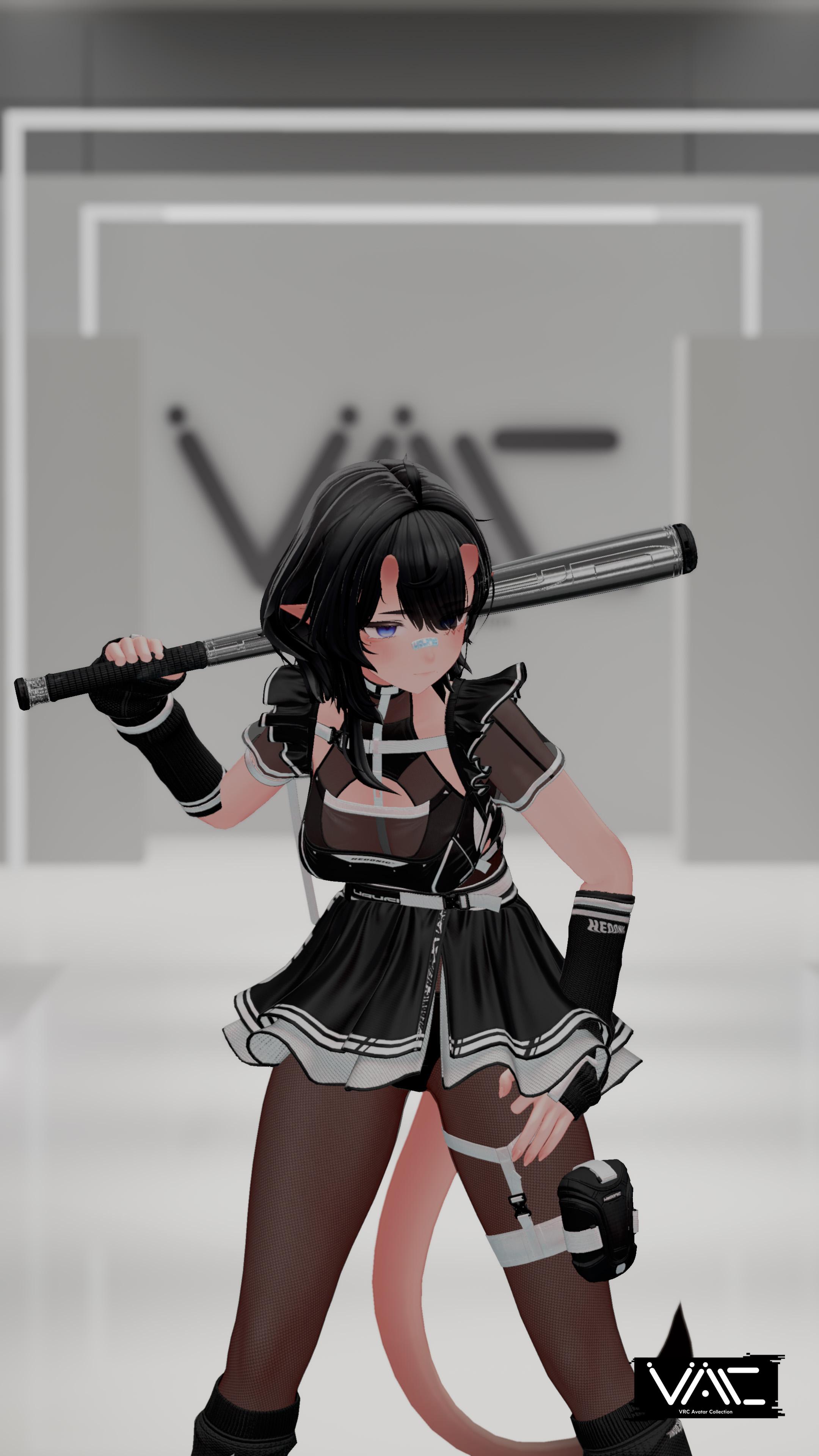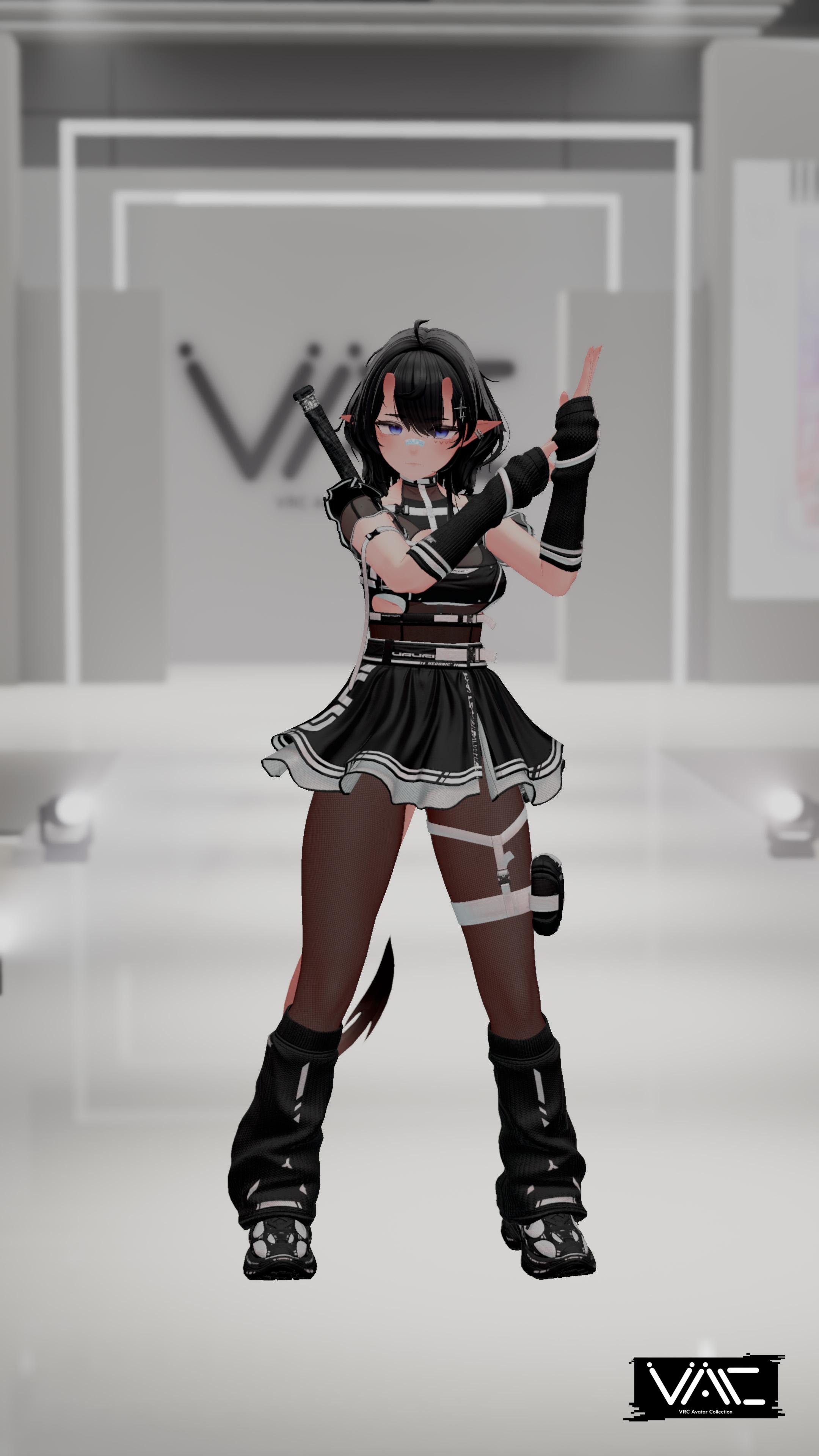 カッコイイxクール系の鬼の女の子です! 角としっぽのシャープなラインと鋭い目線でクールxカッコよさを強調しております。 やわらかいフリルと固いテックの要素が組み合わさってコントラストのある特徴的なメイド服を着ております。