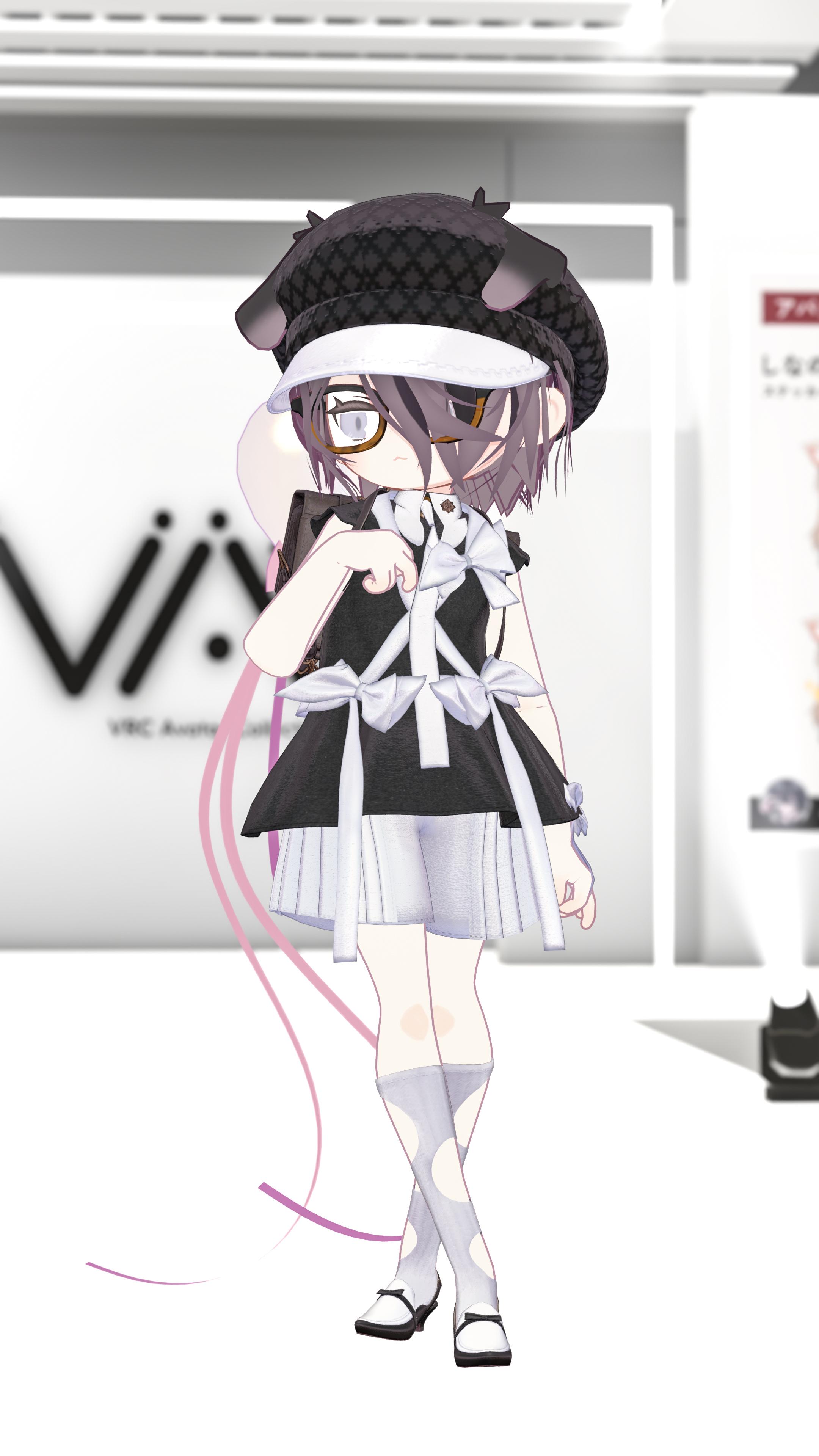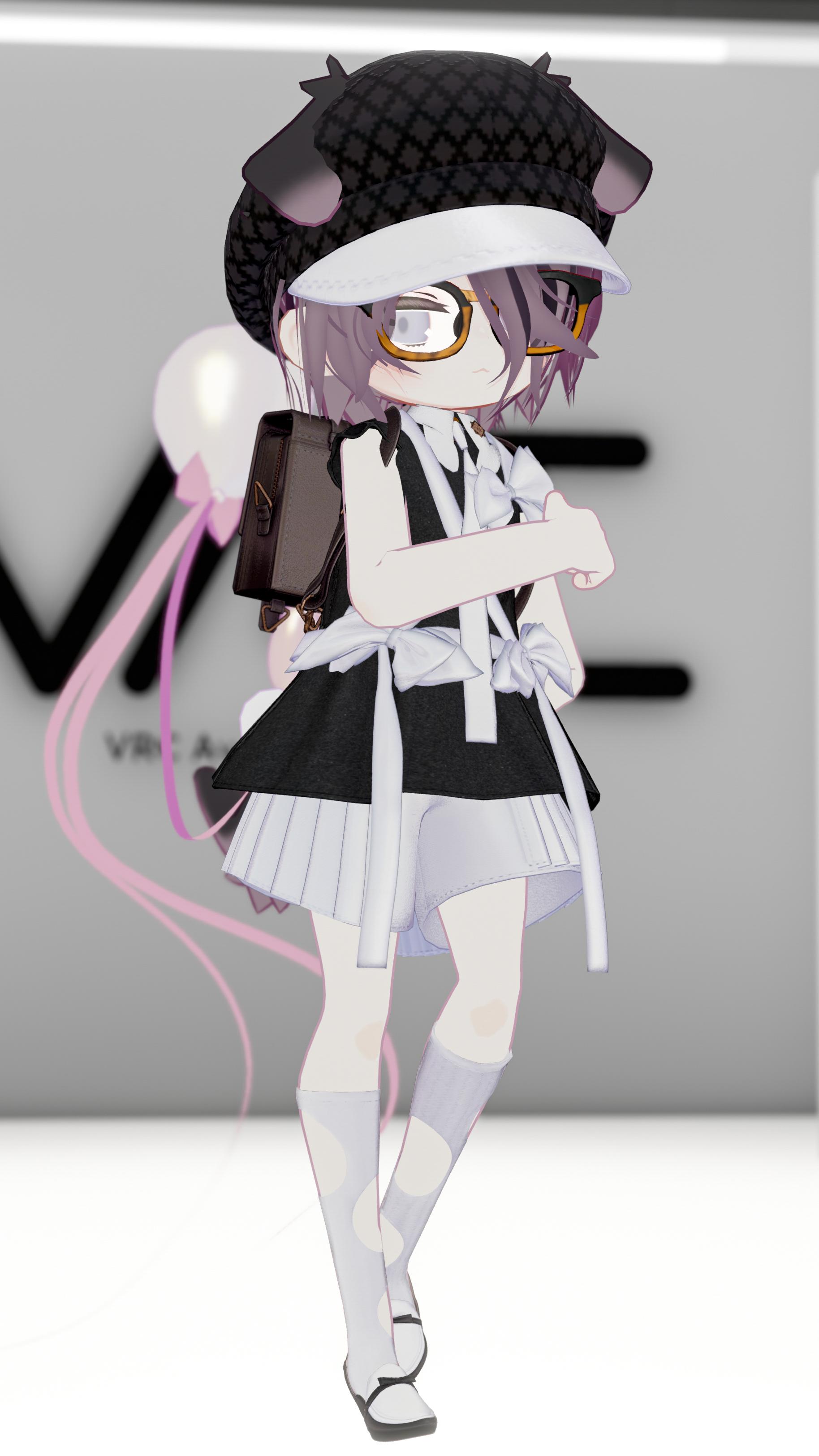 めだかの学校は、スクールテイストをベースにしたセットアップ。リボンは泳ぐめだかをイメージしていて、流れるように配置されたラインが川の動きを思わせます。左右で異なるリボンの配置が、立ち姿や歩き方によって印象を変えてくれます。ニットベレーや大きめのメガネで少しだけクラシックな雰囲気もプラス。カバンは手持ち・リュックの2WAY仕様で、後ろ姿までしっかり映える作りになっています。