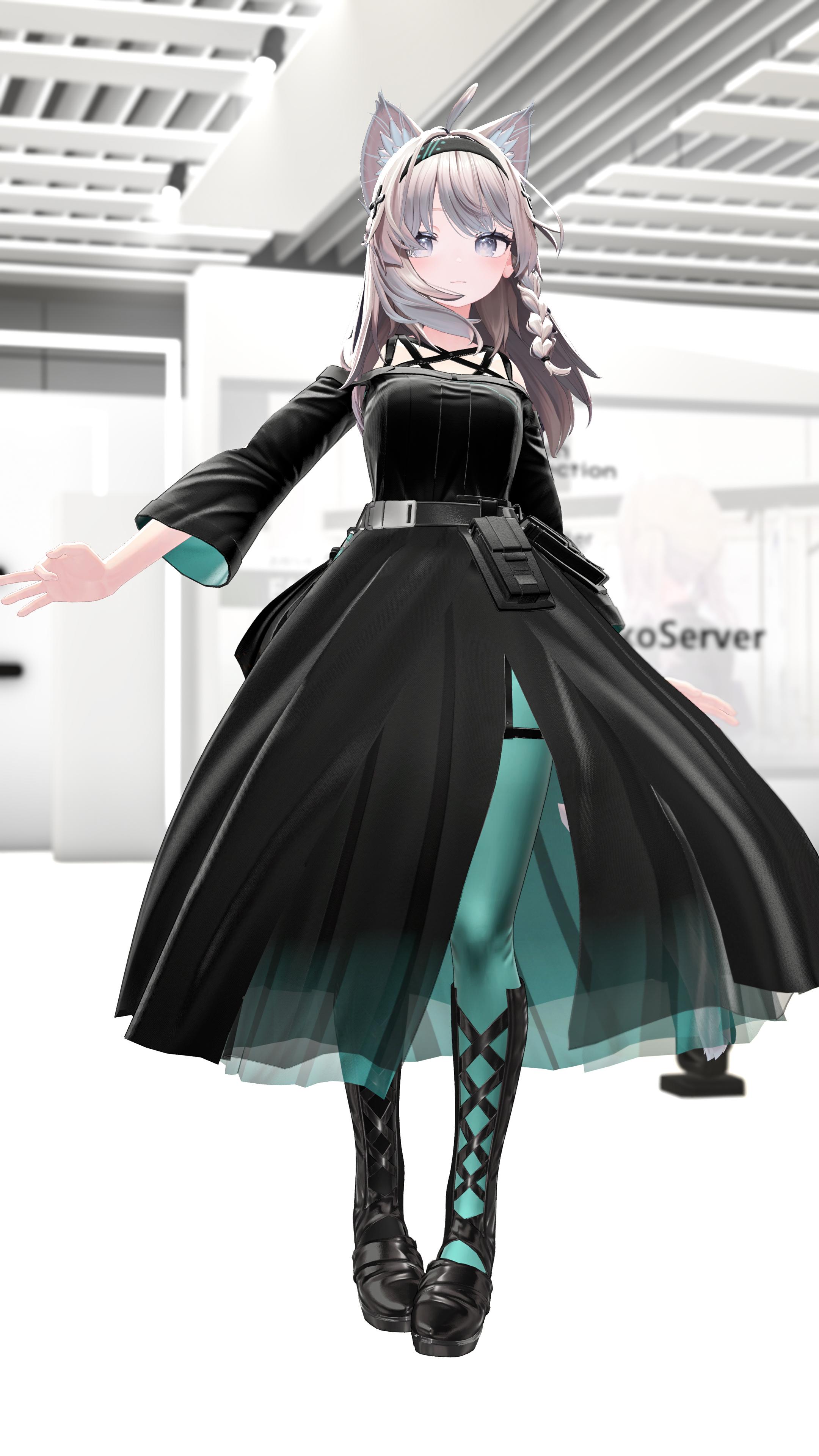 高速二丁銃カードゲーム「ガンナガン W Shout」に登場するキャラクター、「エコ」をイメージしたアバター衣装です。 対戦カードゲームワールド「#VRガンナガン」のクラウドファンディングのリターン品として制作された衣装で、「代替声帯拡張機(だいたいせいたい・かくちょうき)」と呼ばれる喉のデバイスが特徴的になっています。リップシンクと連動して、音波のパーティクルが出るギミックが搭載されており、カードイラストを再現した写真を撮ることも可能です。REARVが作るワールドと同じく、質感にこだわったハイエンドな衣装となっています。