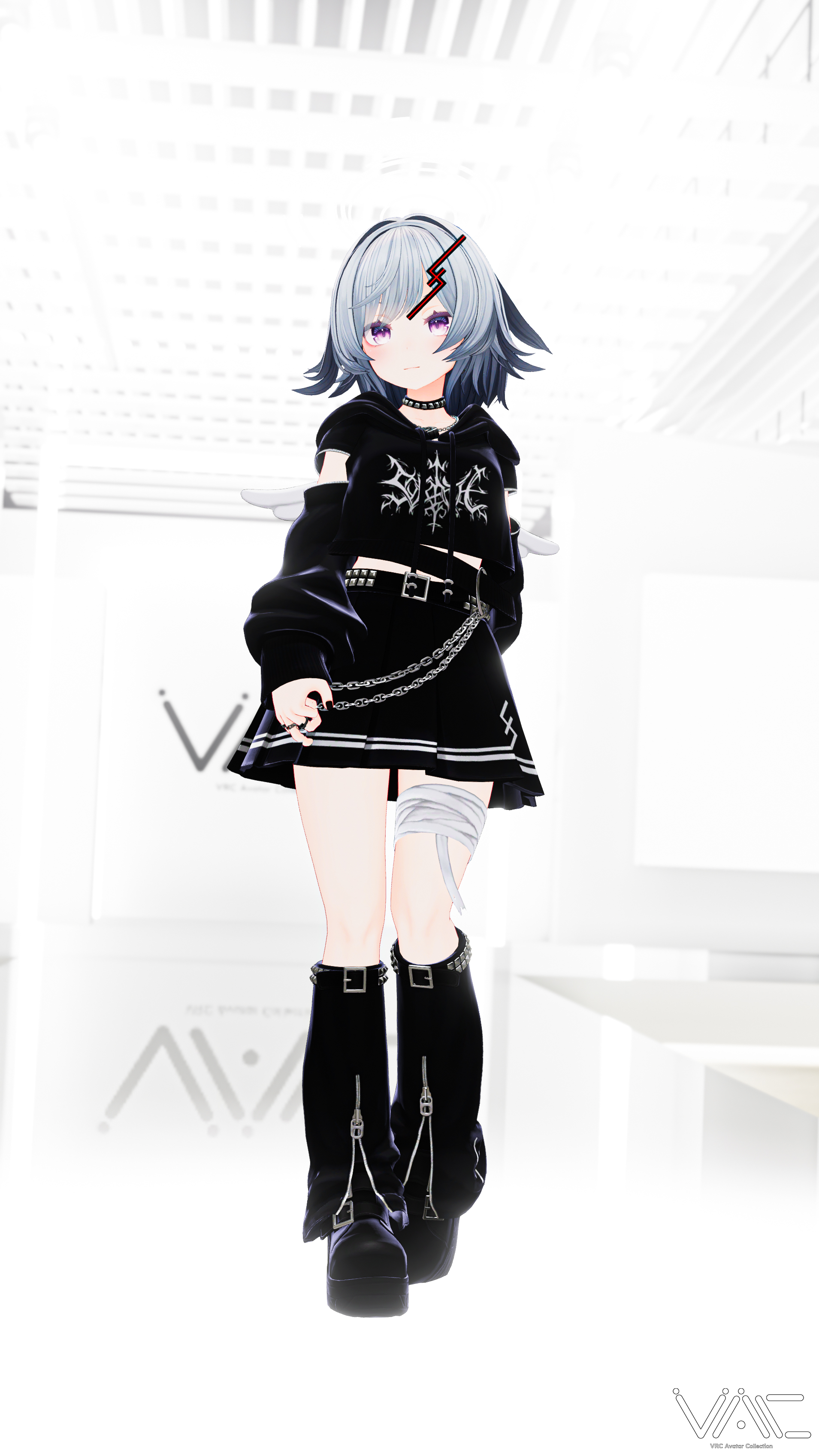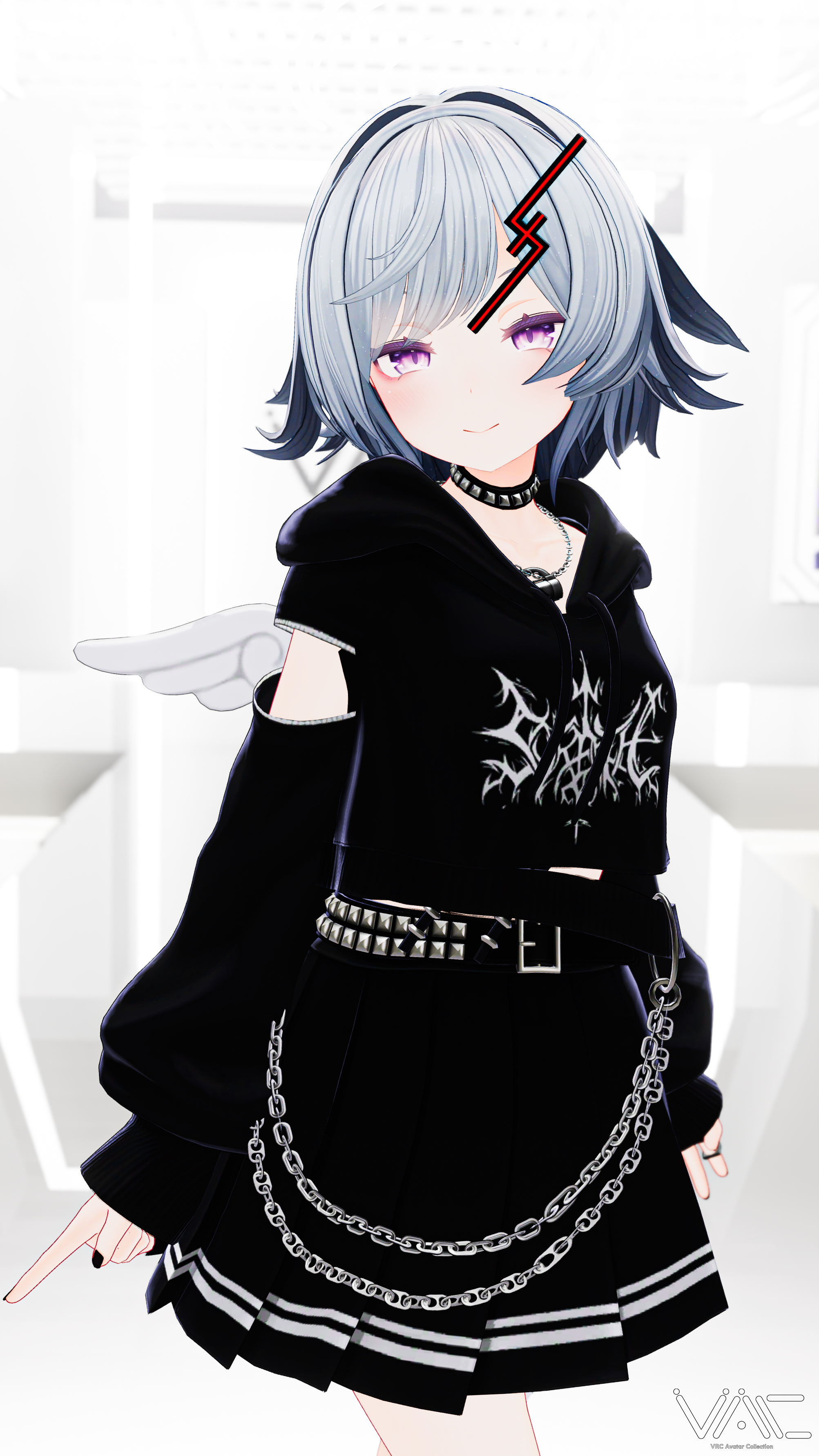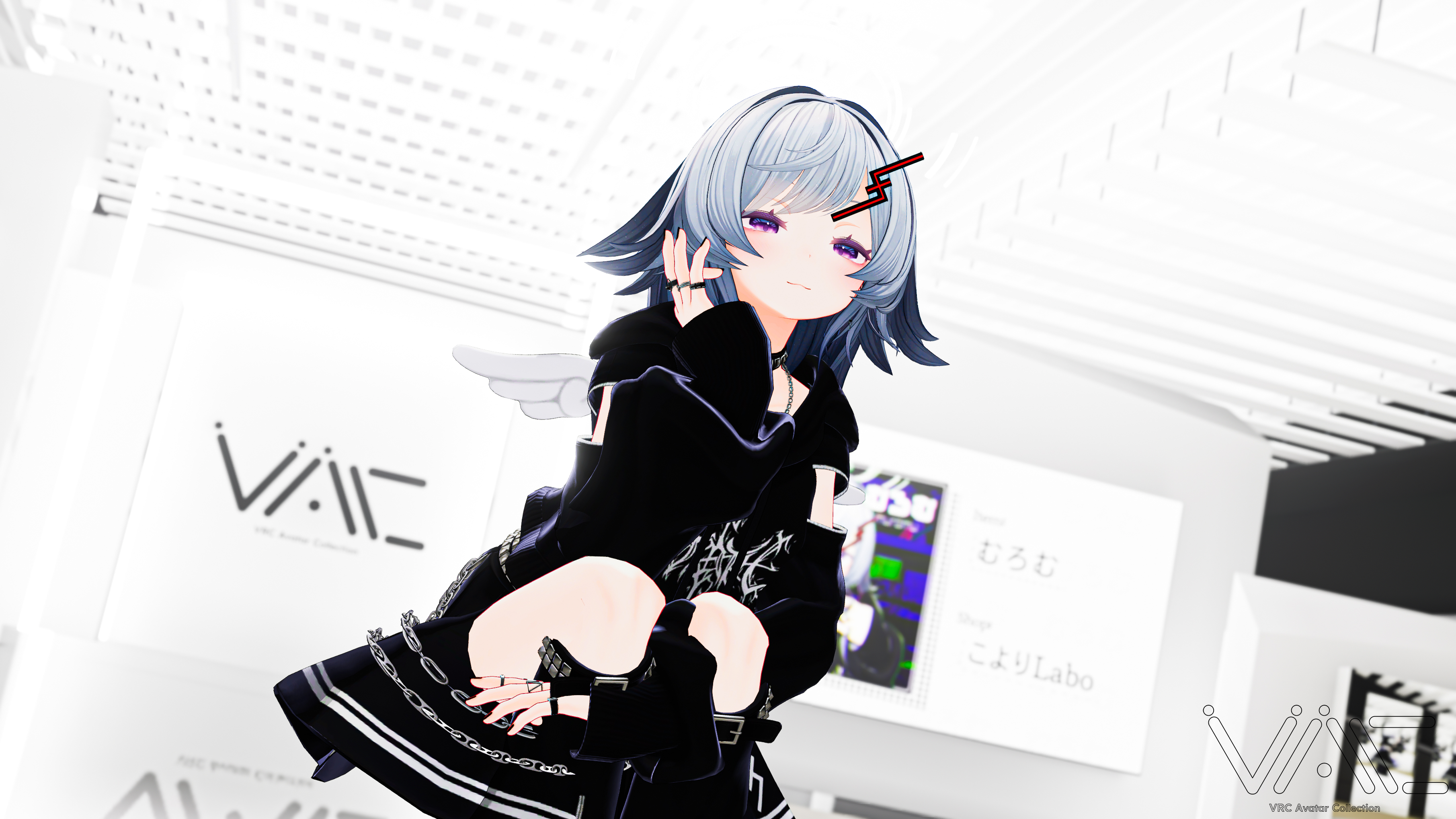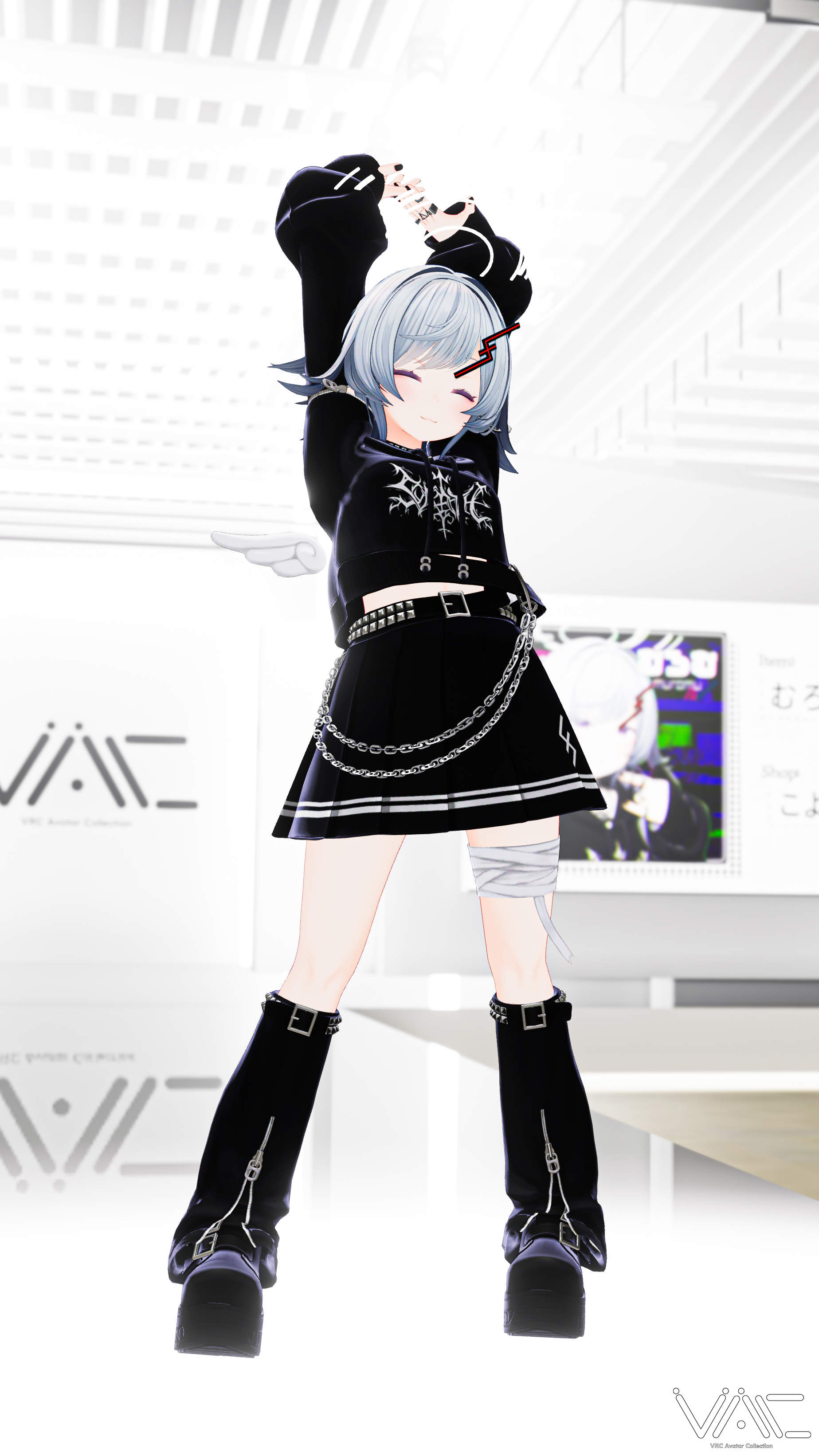 むろむのデザインは、「天使の純粋さ」と「地雷パンクの毒気」を同居させることをテーマにしています。黒を基調としたストリート調の装いに、白い翼やヘイローを組み合わせることで、矛盾した魅力を表現。袖のジッパーやチェーン、厚底ブーツなどのディテールは、現実のファッションとしても成立するような印象にしました。