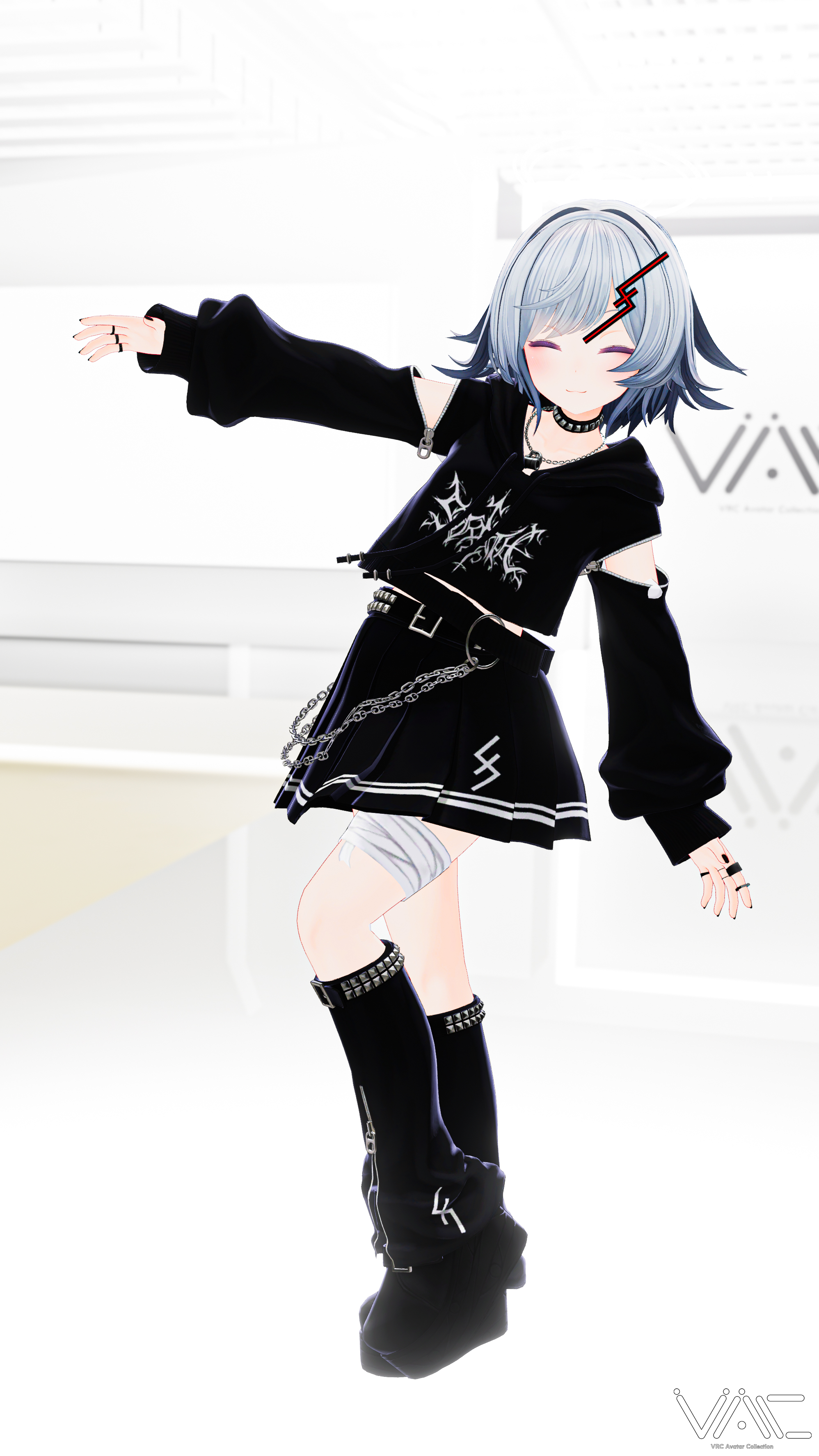 銀髪に淡いライラックの瞳、ジップスリーブの黒パーカーにチェーン、厚底ブーツなど、ストリートとゴシックを融合させた地雷パンクスタイルが特徴。